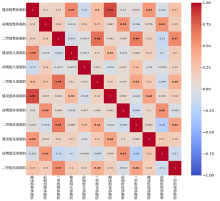 Correlation analysis map of fat content in different pancreatic regions across the three patient groups, with color ranging from blue to red representing correlation values from 0 to 1. The Healthy, Pre-diabetic, and Type 2 groups represent healthy individuals, pre-diabetic patients, and T2DM patients, respectively