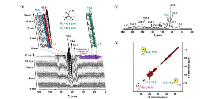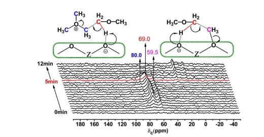 (a) In situ solid-state 13C MAS NMR spectra of continuous-flow 13C-methanol conversion over H-SSZ-13 catalyst at 220 ℃; (b) The 13C CP/MAS NMR and (c) 2D 13C-13C CORD (COmbined R2 Driven) spin diffusion MAS NMR spectra of in situ 13C-methanol conversion over H-SSZ-13 catalyst at 220 ℃ for 30 min[39] Fig.2 ![]()