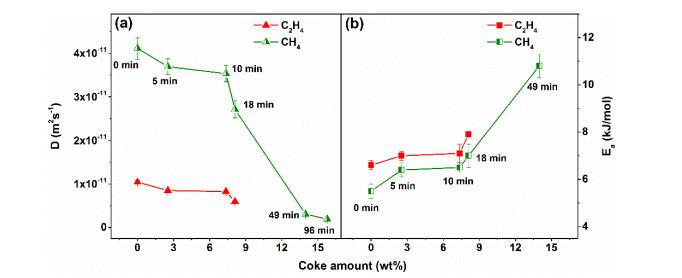 The variation in intracrystalline (a) self-diffusion coefficients and (b) diffusion activation energies of CH4 and C2H4 in flesh and spent SAPO-34 as a function of coke amount, respectively[25] Fig.10