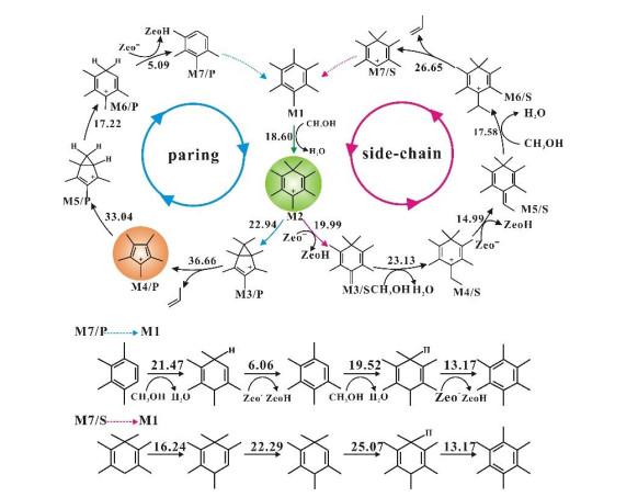 Catalytic cycles of the paring and side-chain reaction mechanisms for the MTO conversion with the involvement of pentaMCP+ and heptaMB + in H-SSZ-13 zeolite[5] Fig.3 ![]()