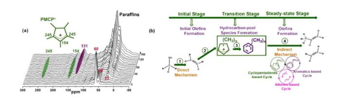 (a) In situ 13C MAS NMR spectra of 13CH3OH reaction over H-SSZ-13 catalyst at 275 ℃, the characteristic signals at 154 and 245 ppm illustrate the formation of pentamethylcyclopentenyl cation (PMCP+), 0~40 ppm are assigned to the paraffin; (b) ① The initial ethene is generated from methanol by direct mechanism; ② MCP species are produced from initial ethene; ③ PMBs species are produced from the co-reaction of MCP species and methanol; ④ The olefins are formed via indirect mechanism including of aromatics-based, alkenes-based, and cyclopentadienes based cycles[47] Fig.4 ![]()