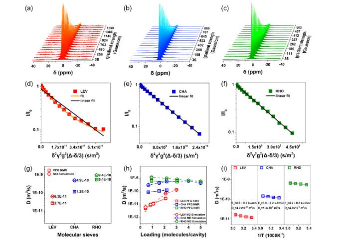 (a~c) 1H PFG NMR signals decay with linearly increasing gradient magnetic field strength in 16 steps for SAPO-35 (a), SAPO-34 (b) and DNL-6 (c) measured at 298 K. (d~f) The corresponding spin echo attention of PFG NMR on the log-linear scale for SAPO-35 (d), SAPO-34 (e) and DNL-6 (f) measured at 298 K. (g) The self-diffusion coefficients of methane acquired by PFG NMR and MD; (h) The loading dependence of experimental and simulated self-diffusion coefficients for methane; (i) The temperature dependence of self-diffusion coefficients for methane[68] Fig.6
