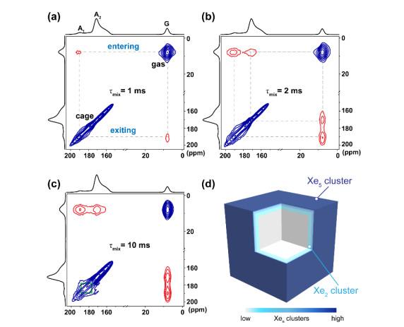 2D EXSY NMR spectra of xenon adsorbed in the SAPO-34 molecular sieve with an average loading of 3.6 xenon atoms per cage at 298 K with mixing times of (a) 1 ms, (b) 2 ms, and (c) 10 ms, respectively; (d) Possible spatial location of Xen clusters in a single SAPO-34 crystal[82] Fig.7 ![]()