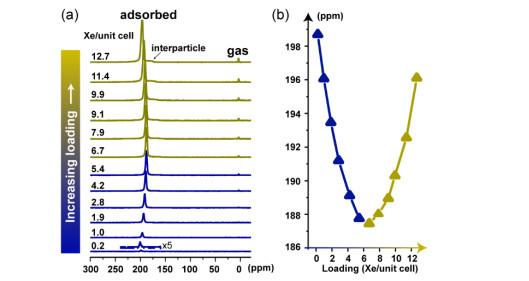(a) Loading-dependent 129Xe NMR spectra of DNL-6 molecule sieves obtained at 298 K; (b) 129Xe NMR chemical shift of adsorbed xenon as the xenon loading increases[83] Fig.8