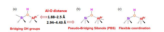 ... [7]. (a) BAS consisting of a bridging silanol site bonded to AlIV site (SiOHAl) in zeolites; (b) BAS consisting of PBS interacting with AlIV site; (c) BAS consisting of the flexible coordination between silanol oxygen and neighbouring AlIV. In the latter two cases, the dotted line does not denote a covalent bond but only the close proximity between O and Al atoms Fig.1