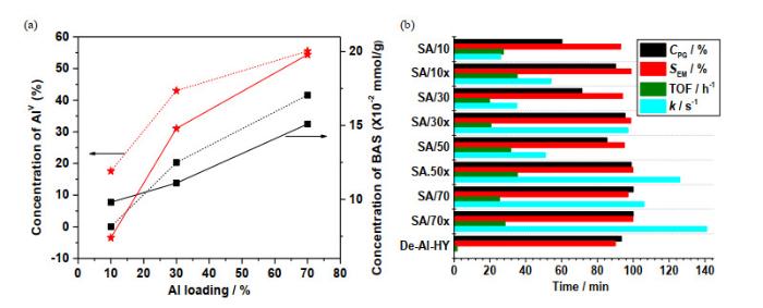 ... ,转换频率(TOFs).数据均来自参考文献[9].反应条件见图 9(a) Correlation between the concentration of Brønsted acidic OH groups (BAS, solid line) and AlV species (dashed line) as a function of the Al content in dehydrated FSP ASAs prepared by using methanol/acetic acid (1:1 by volume, ■) and xylene (★), respectively; (b) Catalytic conversion of PG in ethanol. The PG conversion (CPG), EM selectivity (SEM), reaction rates k, and TOFs were obtained from Ref. [9], respectively. Same reaction conditions as shown in Fig. 9Fig.10
