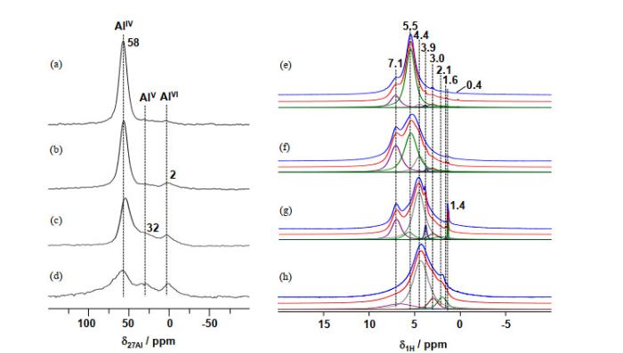 27Al (a~d) and 1H (e~h) MAS NMR spectra of the as-synthesized Pt/ASA dried at different temperatures: room temperature (Pt/ASA-RT) (a, e), 100 ℃ (b, f), 200 ℃ (c, g) and 350 ℃ (d, h) [27]