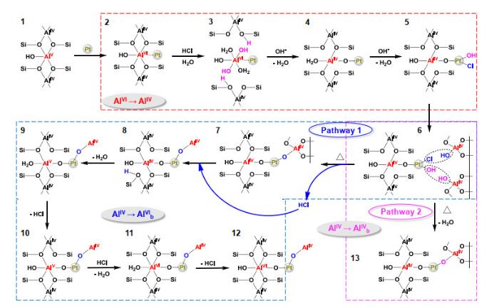 ... Wang等[27]合成了AlV(~48 at.%)富集的ASAs负载的Pt单位点催化剂.相同条件下,Pt主要以团簇及纳米颗粒的形式分布在氧化铝(AlV含量极低)和氧化硅表面.HAADF-STEM及EDS线扫说明单位点Pt的形成依赖于ASAs表面的某种Al位点,而与氧化铝表面的铝位点无明显相关性.如图 11(a)~11(b)所示,负载Pt单位点催化剂后,ASAs表面的AlV含量显著降低,同时有大量的AlIV与AlVI生成.而图 11(c)说明形成Pt团簇及纳米颗粒几乎不会引起AlIV与AlVI的配位变化,这说明单位点Pt的形成仅与AlV的配位变化相关.但是,该27Al MAS NMR谱难以提供合成过程中Pt前驱体(H2PtCl6)与表面AlV作用的信息. ...