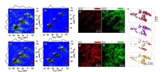 27Al MQMAS spectra of SA/10 (a, b) and SA/30 (c, d) after dehydrated at 723 K (a, c) and after rehydration (b, d), recorded at a magnetic field of 16.4 T, and corresponding EDX images of SA/10 (e, f) and SA/30 (g, h)[6]. (i) 3D-APT reconstruction of isolated SA/10 nanoparticles[8]