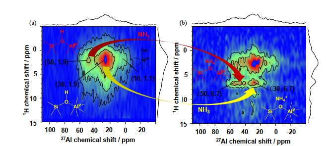 ... [7].相应谱图在18.8 T下采集,相应参数为νR=20 kHz,脱水样品的τrec=1.0 ms,吸氨样品的τrec=900 μs 27Al-{1H} D-HMQC 2D spectra of SA/50. (a) SA/50 dehydrated at 723 K for 12 h under vacuum, and (b) after ammonia loading and evacuated at 373 K for 1 h. The spectra were recorded at 18.8 T with a MAS frequency of νR=20 kHz, and τrec=1.0 ms for dehydrated and τrec=900 μs for ammonia-loaded sample, respectively[7]Fig.3