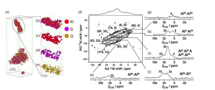 (a)~(e) 3D APT reconstruction of two isolated SA/50 nanoparticles showing all atoms; (f) 27Al DQ-SQ 2D NMR spectrum recorded at 18.8 T with νR=20 kHz of dehydrated SA/50, and (g)~(k) rows extracted from the 2D spectrum corresponding to the various autocorrelation and cross-peaks[8]Fig.6