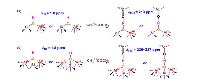 理论计算认为AlV能够与邻近的SiOH产生相互作用,从而促进表面B酸位的形成[15].但由于缺乏AlV与SiOH相互作用的相关证据,该假设存在广泛争议.首先,常用的一维27Al MAS NMR谱,如1H/27Al双共振实验(TRAPDOR)与27Al{1H}交叉极化(CP)实验,能够提供质子与邻近Al原子的作用信息,但是不能用于区分Al原子的配位[37].二维NMR相关谱广泛用于研究沸石中B酸位的微观结构,同时能够区分不同配位Al原子与邻近质子的相关性[38, 39].但是应用二维NMR相关谱研究ASAs的结构非常困难.这主要是由于ASAs中缺乏长程有序结构、铝的化学环境分布广泛,因而导致探测信号的灵敏度低且相互重叠,特别是难以实现对ASAs中含量极低的AlV的观测.