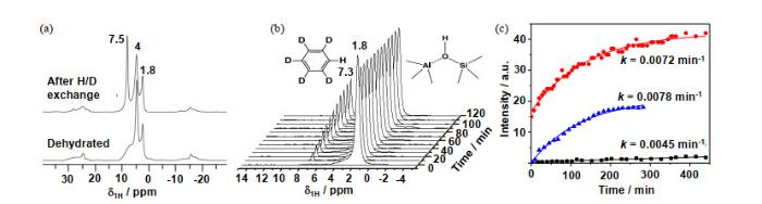 Catalytic performance of H-ZSM-5 and AlV-enriched ASAs in H/D exchange with d6-benzene at 313 K. 1H MAS NMR spectra at 9.4 T of (a) zeolite H-ZSM-5 and (b) SA/50 (stack plot spectra). (c) Kinetics and H/D exchange rates k for H-ZSM-5 (top), SA/50 (middle), and SA/10 (bottom)[8]