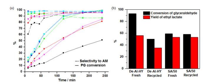 Catalytic conversion of C3 sugars over ASAs. (a) Catalytic conversion of phenylglyoxal (―) and selectivity to alkyl mandelate (---) as a function of reaction time in MeOH (■), EtOH (●), i-PrOH (▼), n-PrOH (◆), n-BuOH (▲) over SA/70 and reaction in i-PrOH (★) over De-Al-HY[26]. (b) Catalytic glyceraldehyde conversion in ethanol over fresh De-Al-HY and SA/50 and after five recycle uses. Conditions: 1.25 mL of alcohol solution containing 0.4 mol/L phenylglyoxal or glyceraldehyde, 0.05 g catalyst, at 363 K for 6 h with stirring[8]Fig.9