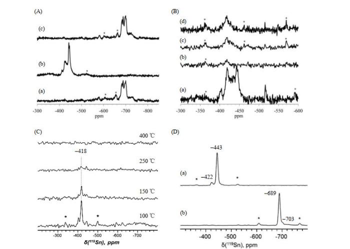 ... Sn DP-CPMG MAS NMR谱图,*表示旋转边带(根据文献[6]和[26]修改) (A) 119Sn MAS NMR spectra of Sn-Beta after different treatments: (a) Calcined; (b) Dehydrated after calcination; (c) Rehydrated after step (b). (B) (a) 119Sn MAS and (b~d) 1H-119Sn CP MAS NMR spectra of dehydrated Sn-Beta. The CP contact times from 1H to 119Sn were varied: (b) 0.2 ms, (c) 1.0 ms, (d) 2.0 ms. (C) 1H-119Sn CP-CPMG MAS NMR spectra of 119Sn-Beta sample dehydrated under vacuum conditions at different temperatures. (D) 119Sn DP-CPMG MAS NMR spectra of (a) dehydrated and (b) hydrated Sn-Beta. The spinning sidebands are marked as asterisks (Reproduced from Refs. [6] and [26])Fig.1