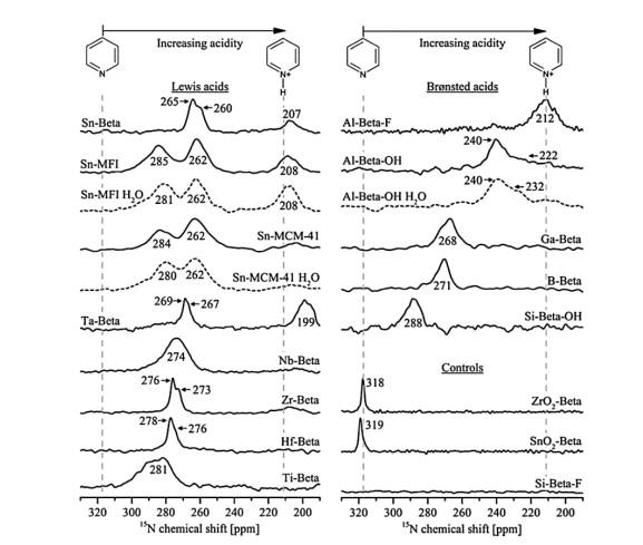 众所周知,作为一种固体酸催化剂,分子筛的酸性特征(酸类型、酸强度、酸浓度与酸分布等)与其催化反应性能密切相关[15, 37].尽管119Sn和1H MAS NMR方法能够准确提供锡硅分子筛的活性中心结构信息,但并不能给出这些重要的酸性特征.为解决这一难题,往往需要借助探针分子吸附的方法.通过选择合适的探针分子,就可以获得锡硅分子筛相应的酸性信息.常用的NMR探针分子主要有氘代吡啶、氘代乙腈、2-13C-丙酮、三甲基膦(TMP)、三烷基氧膦等等[13, 15, 17-22, 38-49]. ...