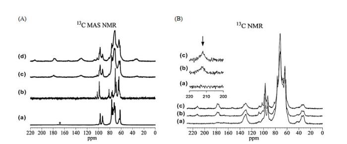 (A) 13C MAS NMR of (a) glucose adsorbed into Si-Beta, (b) fructose adsorbed into Si-Beta, (c) glucose adsorbed into Sn-Beta, (d) fructose adsorbed into Sn-Beta. (B) Spectra from fructose adsorbed into Sn-Beta: (a) CP contact time of 0.1 ms; (b) CP contact time of 1.0 ms; and (c) no CP (Reproduced from Ref. [6])