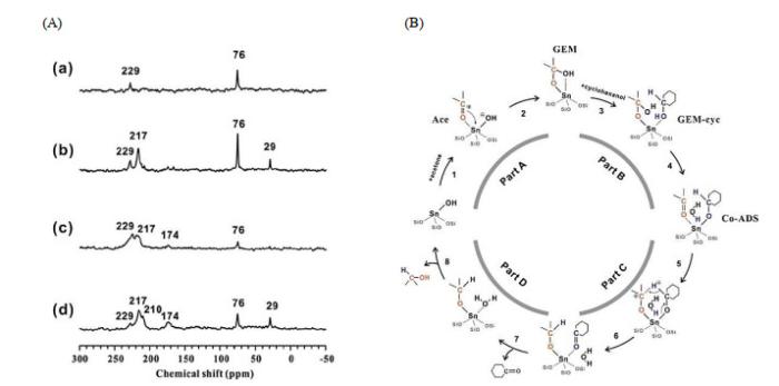 (A) 13C CP MAS NMR spectra of (a) 30 μmol⋅g−1 and (b) 100 μmol⋅g−1 of 2-13C-acetone adsorbed on Sn-Beta zeolite dehydrated at 393 K, (c) 30 μmol⋅g−1 and (d) 100 μmol⋅g−1 of 2-13C-acetone adsorbed on Sn-Beta zeolite dehydrated at 673 K. (B) Proposed catalytic cycle for the reaction between acetone and cyclohexanol on Sn-Beta zeolite. (Reproduced from Ref. [50])