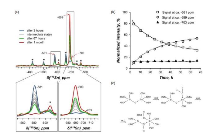 ... Sn MAS NMR signals at ca. −581, −689, and −703 ppm with time of exposure to water; (c) Dissociative adsorption scheme of water over tin sites in Sn-Beta (Reproduced from Ref. [26]) Fig.2