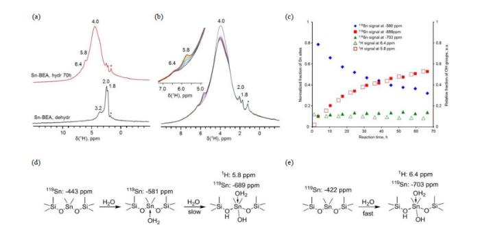 (a) 1H MAS NMR spectra of dehydrated Sn-Beta before and after exposure to water vapors for 70 h; (b) Time-resolved 1H MAS NMR spectra acquired during the hydration of Sn-Beta; (c) Normalized intensities of 1H and 119Sn MAS NMR signals vs. hydration time; (d, e) Two different hydration mechanism in dehydrated Sn-Beta (Reproduced from Ref. [27])