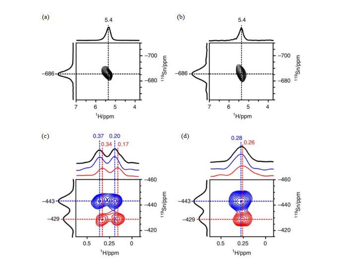 ... Sn去耦(根据文献[36]修改) Two-dimensional 1H-119Sn HMQC MAS NMR spectra of Sn-Beta. (a) Without dehydration; (b) Dehydrated at 298 K; (c) Dehydrated at 393 K without 119Sn decoupling; (d) Dehydrated at 393 K with 119Sn decoupling (Reproduced from Ref. [36])Fig.42 锡硅分子筛酸特性的固体NMR研究
