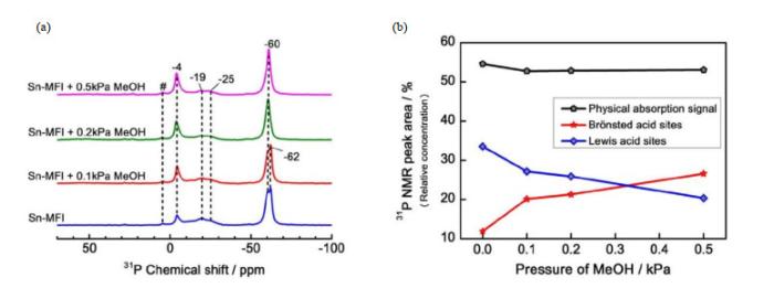 ... P-TMP NMR spectra of Sn-MFI zeolite under different methanol pressure; (b) The Lewis and Brønsted acid amounts of Sn-MFI zeolite under different methanol pressure (Reproduced from Ref. [13]) Fig.5