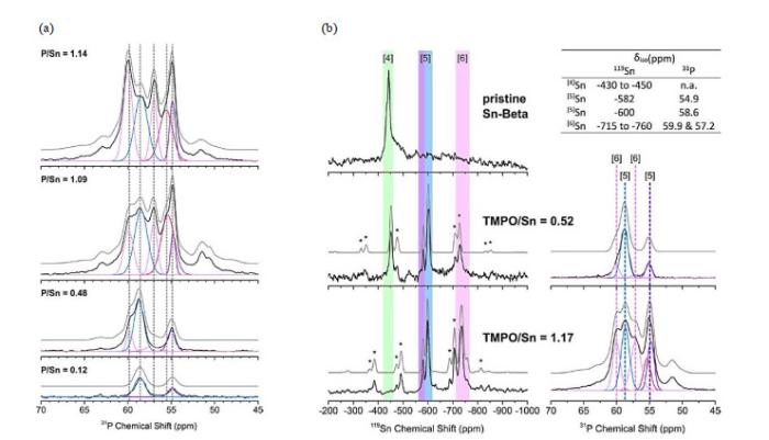 (a) 31P MAS NMR spectra of TMPO dosed on Sn-Beta at different loading levels; (b) 119Sn and 31P MAS NMR spectra of 119Sn-Beta with different TMPO loadings (Reproduced from Ref. [45])