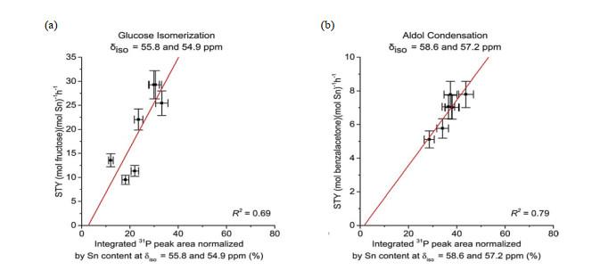 ... 58.6和57.2的“closed”锡位点)含量与催化苯甲醛与丙酮缩合反应活性之间的关联(根据文献[45]修改) Site time yield (STY) for (a) glucose isomerization in water and (b) aldol condensation of benzaldehyde and acetone in toluene catalyzed by different Sn-Beta catalysts plotted against the percent integrated 31P peak area normalized by P and Sn content at (a) δiso = 55.8 and 54.9 ppm and (b) δiso = 58.6 and 57.2 ppm (Reproduced from Ref. [45])Fig.7
