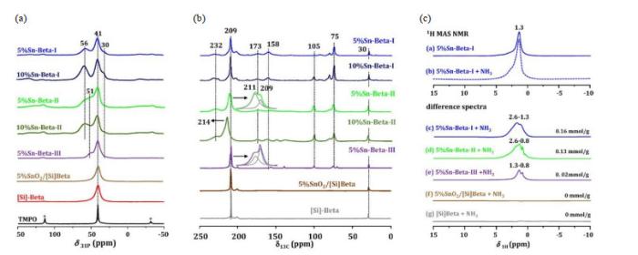 (a) 31P MAS and (b) 13C CP MAS NMR spectra of Si-Beta and Sn-containing Beta zeolites recorded after adsorption of TMPO and 2-13C-acetone, respectively. (c) 1H MAS NMR or difference spectra of various dehydrated Sn-containing Beta zeolites recorded before and after adsorption of ammonia (Reproduced from Ref. [46])