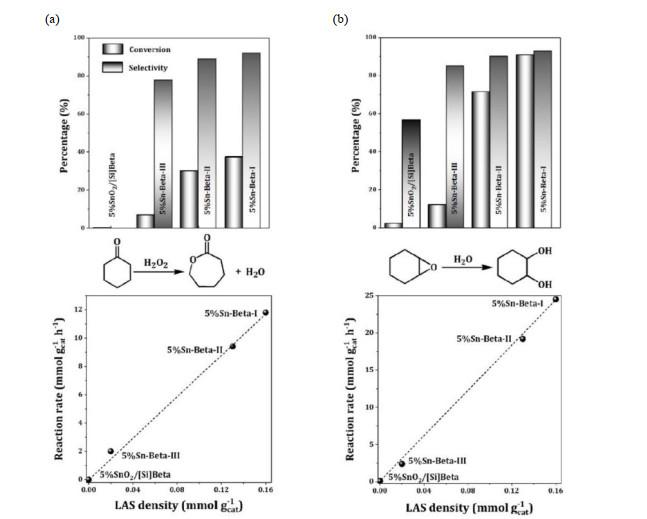 ... 锡硅分子筛催化(a)环己酮BV氧化、(b)氧化环己烯水合反应性能与可接近性Lewis酸(LAS)酸量之间的关联(根据文献[46]修改) Catalytic performance of the Sn-containing catalysts in the (a) BV oxidation of cyclohexanone and (b) cyclohexene oxide hydration, as well as the plots of reaction rates as a function of the number of accessible LAS (Reproduced from Ref. [46])Fig.9