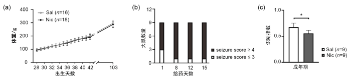 尼古丁对青少年雌性大鼠(a)体重、(b)癫痫发作评分、(c)新物体识别测试的影响,*代表p < 0.05