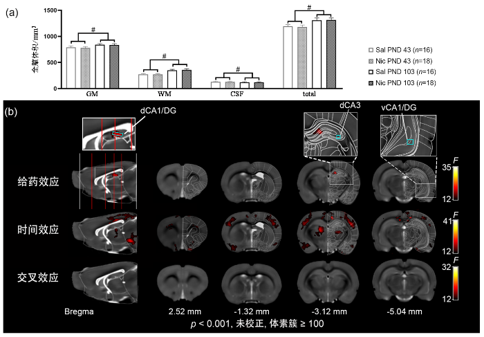 (a)尼古丁对青少年雌性大鼠脑体积的影响,#代表时间效应p < 0.05;(b)体素水平全脑灰质体积的双因素方差分析结果
