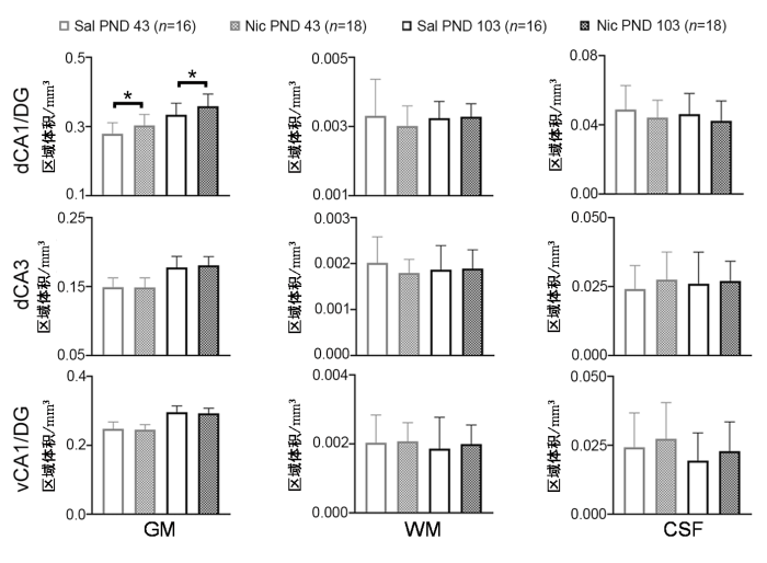 图3分别展示了ROI水平海马亚区[dCA1/DG, 背侧海马阿蒙角3区(dCA3), 腹侧海马阿蒙角1区与腹侧齿状回(vCA1/DG)]的GM、WM、CSF体积.双因素方差分析结果显示尼古丁给药在dCA1/DG亚区的GM体积中呈现显著性效应[F (1, 64) = 14.25, p < 0.001]. 经FDR校正的事后检验表明,在年龄相同的雌性大鼠中,Nic组dCA1/DG的GM体积相较于Sal组显著增加(p < 0.02, FDR校正).然而,在年龄相同的雌性大鼠中,Nic组和Sal组的WM、CSF体积均无显著性差异.此外,在相同年龄的雌性大鼠中,尼古丁给药对dCA3和vCA1/DG亚区的GM、WM、CSF体积均无显著性影响,表明尼古丁对海马亚区体积的影响具有区域特异性.