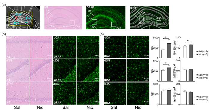 尼古丁对青少年雌性大鼠背侧海马亚区短期内组织学/免疫组织学的影响,*代表p < 0.05. (a) GM增大区域以及HE、GFAP、IBA1染色的背侧海马冠状面展示,正方形方框代表亚区的位置;(b)背侧海马亚区的HE、GFAP染色代表图;(c)背侧海马亚区IBA1染色代表图以及IOD与小胶质细胞胞体面积的统计结果