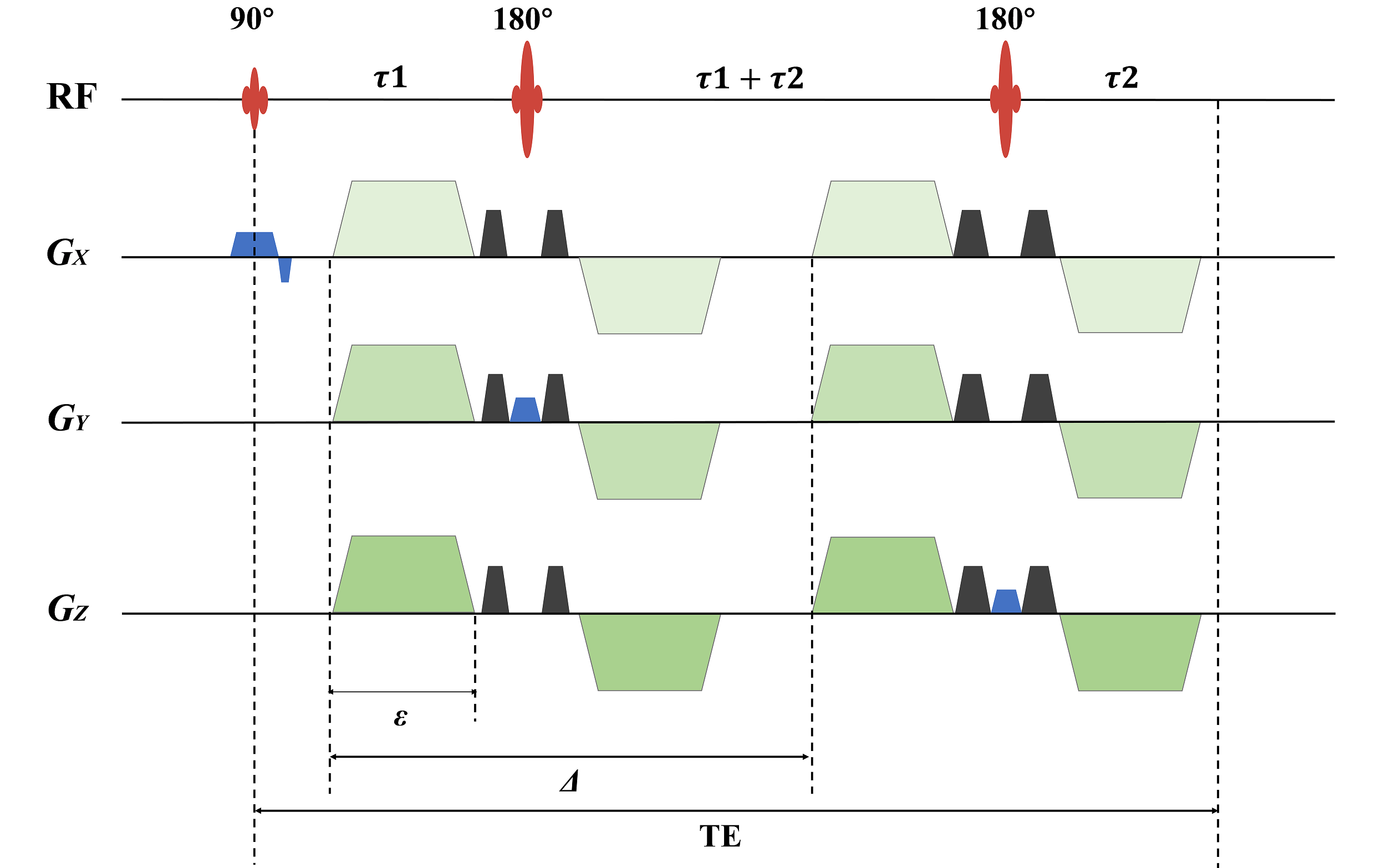 | Fig. 1 Sequence diagram of diffusion-weighted point resolved spectroscopy. RF denotes the radiofrequency pulse, while GX, GY, and GZ represent the gradients along the left-right, anterior-posterior, and head-foot directions, respectively. The blue color indicates the localization gradient, black represents the spoiling gradient, and green denotes the diffusion gradient. The echo time (TE) is defined as twice the sum of τ 1 and τ 2. ε denotes the duration of the applied diffusion gradient, while Δ represents the interval between the diffusion gradient pairs (i.e., the diffusion time), which is half the duration of TE |