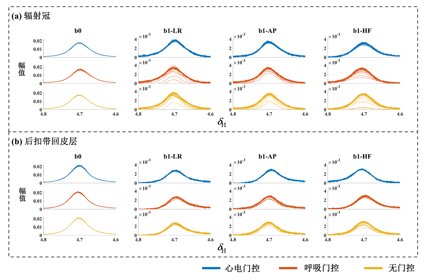 | Fig. 4 Variations in signal intensity of the water peak in each transient spectrum acquired using different gating methods for a subject. (a) The volume of interest is located in the corona radiata region; (b) The volume of interest is located in the posterior cingulate cortex region. b0 represents the signal without diffusion gradient application, while b1-LR, b1-AP, and b1-HF denote the signals with the diffusion gradient applied in the left-right, anterior-posterior, and head-foot directions, respectively. Blue, orange, and yellow indicate the use of ECG gating, respiratory gating, and no gating, respectively |