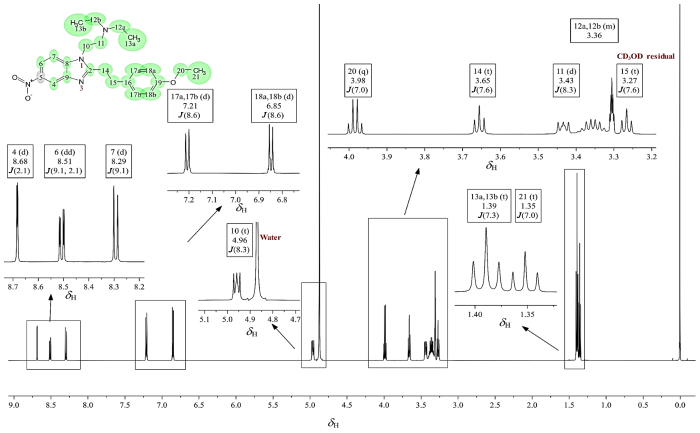 | 6 | 122.5 | CH | 8.51 (1H, dd, 9.1, 2.1) | + | H-7 | H-4, H-7 | C-4, C-8, C-9 |