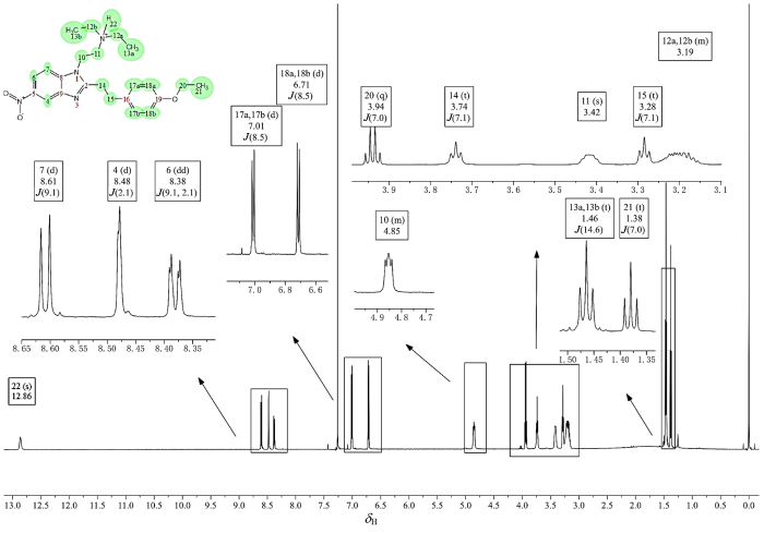 第2耦合系统是由δH 7.21 (2H, d, J = 8.6 Hz) 和δH 6.85 (2H, d, J = 8.6 Hz) 构成的苯环典型AA'BB'系统,OCH2CH3属于给电子的邻对位定位基,故间位的电子云密度低,化学位移高,按照化学位移规律将其分别归属为H-17a、H-17b和H-18a、H-18b.第3耦合系统是乙二胺片段中两个亚甲基δH 4.96 (2H, t, J = 8.3 Hz) 和δH 3.43 (2H, t, J = 8.3 Hz) 构成的一组A2X2系统,根据氢谱峰型和化学位移规律可以归属为H-10和H-11,但其三重峰并不标准.第4耦合系统是苯环上乙氧基δH 3.98 (2H, q, J = 7.0 Hz) 和δH 1.35 (3H, t, J = 7.0 Hz) 构成的A2X3系统,归属为H-20和H-21.第5耦合系统是苯乙基中两个亚甲基δH 3.65 (2H, t, J = 7.6 Hz) 和δH 3.27 (2H, t, J = 7.6 Hz) 构成的A2B2系统,直接与苯并咪唑环相连的CH2电子云密度更低,所以依次归属为H-14和H-15.根据尼秦类物质的结构通式(表1),尼秦类物质常用亚甲基连接的对位取代苯环,该CH2会受到苯并咪唑环和苯环的双重吸电子作用,所以1H NMR中常常会在δH 4.3附近呈现包含两个质子的单峰,因此该耦合系统的化学位移和峰型差异是区分苄基尼秦和苯乙基尼秦的重要判据.第6耦合系统是乙二胺氮上连接的两个乙基δH 3.36 (m, 4H) 和δH 1.39 (t, J = 7.3 Hz, 6H),通过化学位移规律可以很快速的归属为H-12a、H-12b和H-13a、H-13b,但氢谱的峰型变化却值得深入讨论.