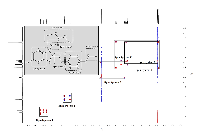 1H-1H TOCSY spectrum of phenylethyl etonitazene and six characteristic spin systems (CD3OD)