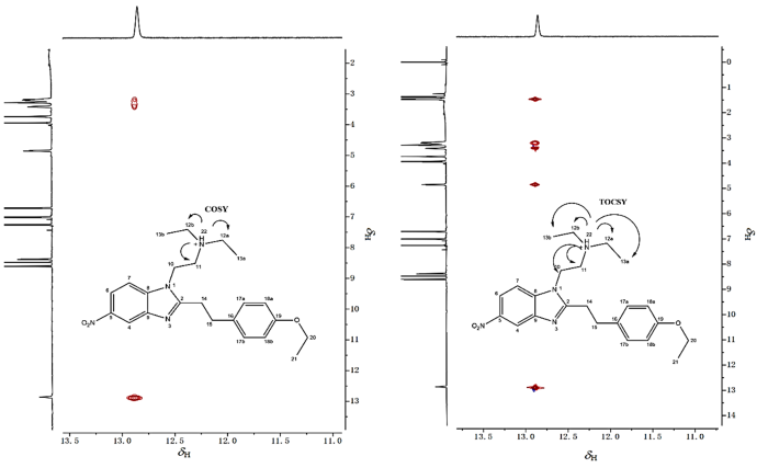 1H-1H COSY and 1H-1H TOCSY spectrum of phenylethyl etonitazene (CDCl3, 11.0~13.5)