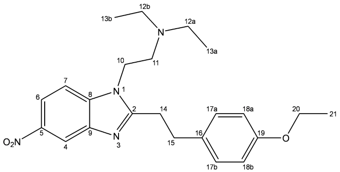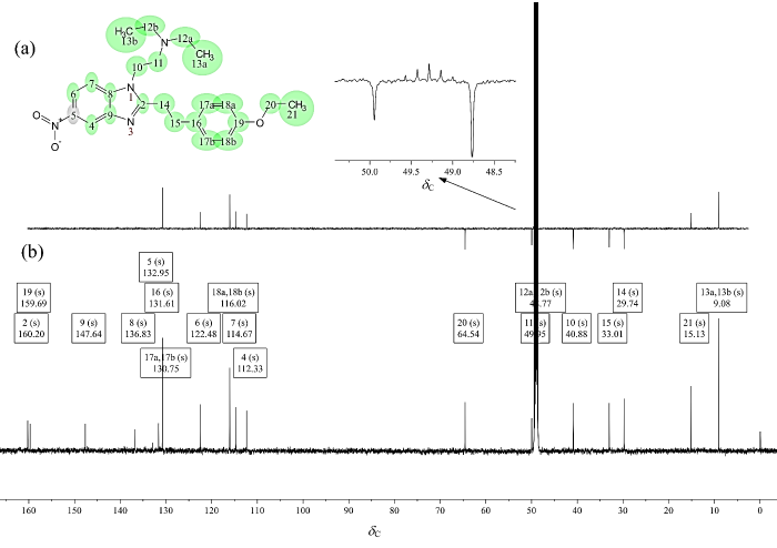 (a) DEPT-135 and (b) 13C NMR spectrum of phenylethyl etonitazene (CD3OD)