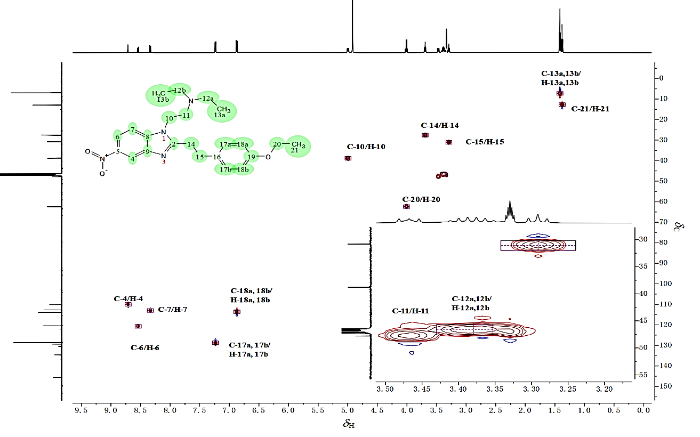 最后详细分析苯并咪唑苯环内各季碳的耦合情况:δ c 147.6与δH 8.68 (H-4)、δH 8.51 (H-6) 和δH 8.29 (H-7) 都呈现出明显相关,故将其归属为C-9.δ c 136.8不仅与δH 8.68 (H-4) 和δH 8.51 (H-6) 相关,还与δH 4.96(H-10) 相关,将其归属为C-8.而δ c 132.9仅与δH 8.68 (H-4) 和δH 8.29 (H-7) 相关,将其归属为C-5.最后仅剩一个季碳δ c 131.6未归属,而δ c 131.6与δH 6.85 (H-18a和H-18b) 和δH 3.65 (H-14) 相关,将其归属为C-16.上述归属完全符合碳化学位移规律,同时1H-13C HMBC再次验证了氢谱归属.