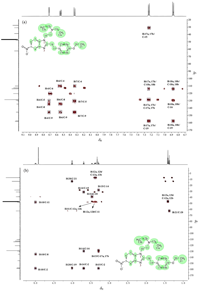 The 1H-13C HMBC partial spectrum of phenylethyl etonitazen[CD3OD]. (a) δH: 6.7~9.1; (b) δH: 0.9~5.5