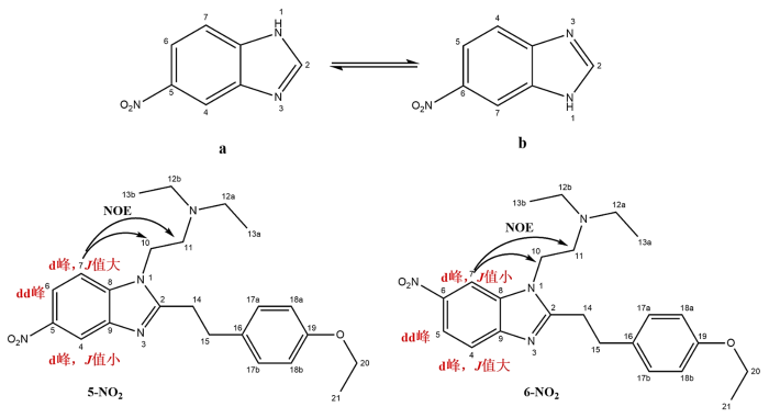 1H-13C HMBC(图13)指出,δ c 160.2与δH 4.96 (H-10)、δH 3.65 (H-14) 和δH 3.27 (H-15) 相关,表明δ c 160.2应归属为咪唑环的C-2.δ c 159.7与δH 7.21 (H-17a和H-17b)、δH 6.85 (H-18a和H-18b) 以及δH 3.98 (H-20) 相关,表明δ c 159.7应归属为苯环中与氧直接相连的C-19.δ c 147.6、δ c 136.8、δ c 132.9三个碳主要与苯并咪唑环的芳香氢相关,可以确定为苯环内季碳,继续归属前,需要先确认苯并咪唑环的构型,苯并咪唑环存在2种异构体,通过1H-1H NOESY(附件材料图S1)发现δH 8.29 (H-7) 与δH 4.96 (H-10) 和δH 3.43 (H-11) 相关,表明苯并咪唑环的构型为a而非b(图14,若为b型则H-7的耦合常数应小于H-4).