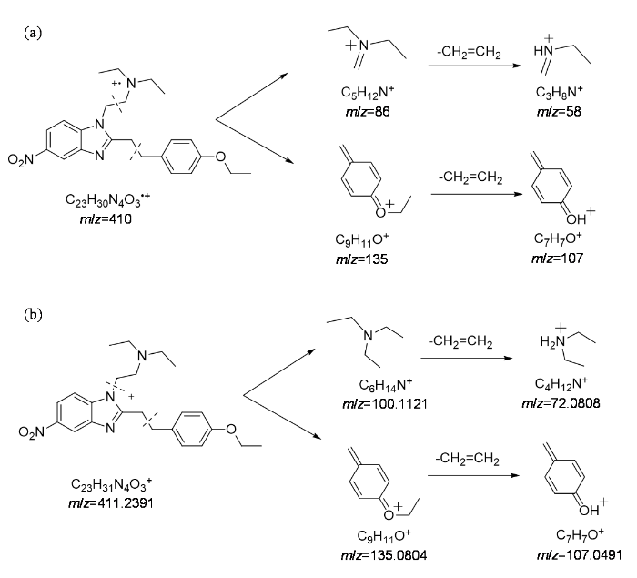 Possible EI fragmentation patterns (a) and ESI fragmentation patterns (b) of phenylethyl etonitazene