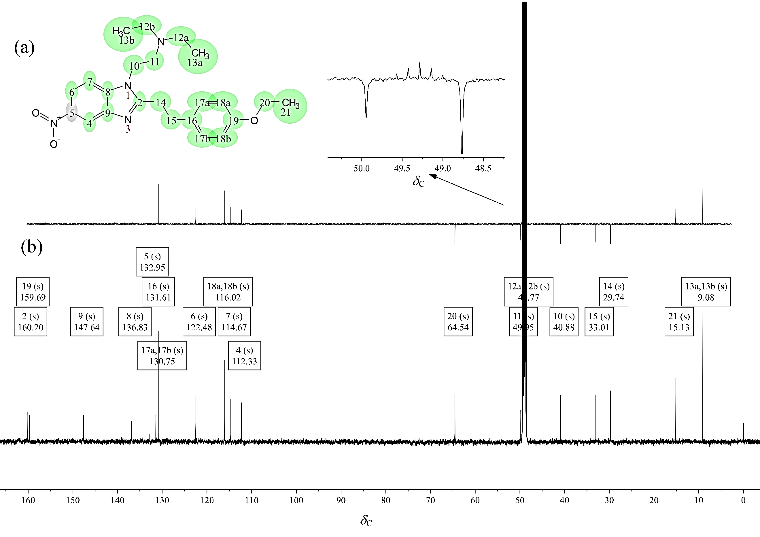 | 图11 苯乙基依托尼秦的(a) DEPT-135谱和(b) 13C NMR谱(CD3OD) |
