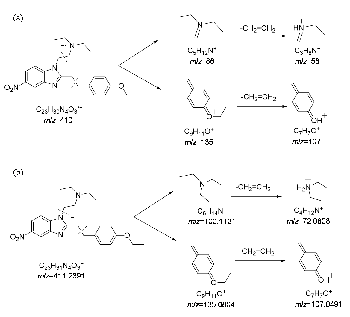 | Fig. 4 Possible EI fragmentation patterns (a) and ESI fragmentation patterns (b) of phenylethyl etonitazene |