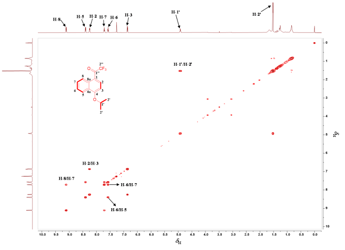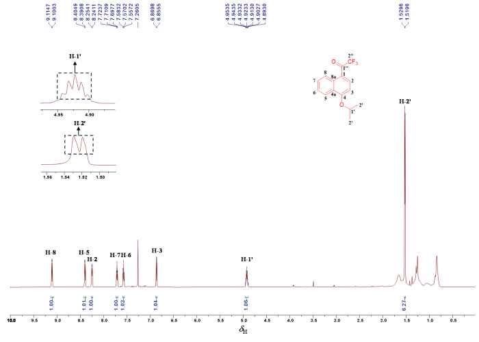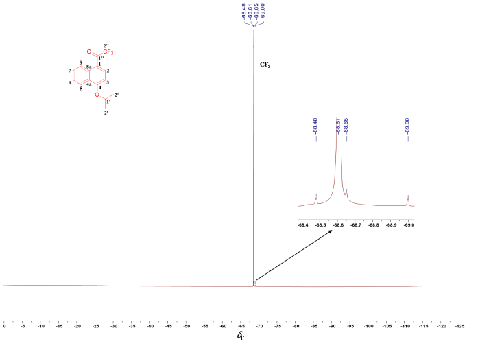In this paper, one-dimensional (1H NMR, 13C NMR, DEPT, and 19F NMR) and two-dimensional NMR (1H-1H COSY, 1H-13C HMBC, and 1H-13C HSQC) techniques were applied to perform structural identification and NMR spectral assignments of the fluorine-containing compound 4-isopropoxy-1-(trifluoroacetyl)naphthalene. This paper could serve as a reference for further research on this class of compounds.