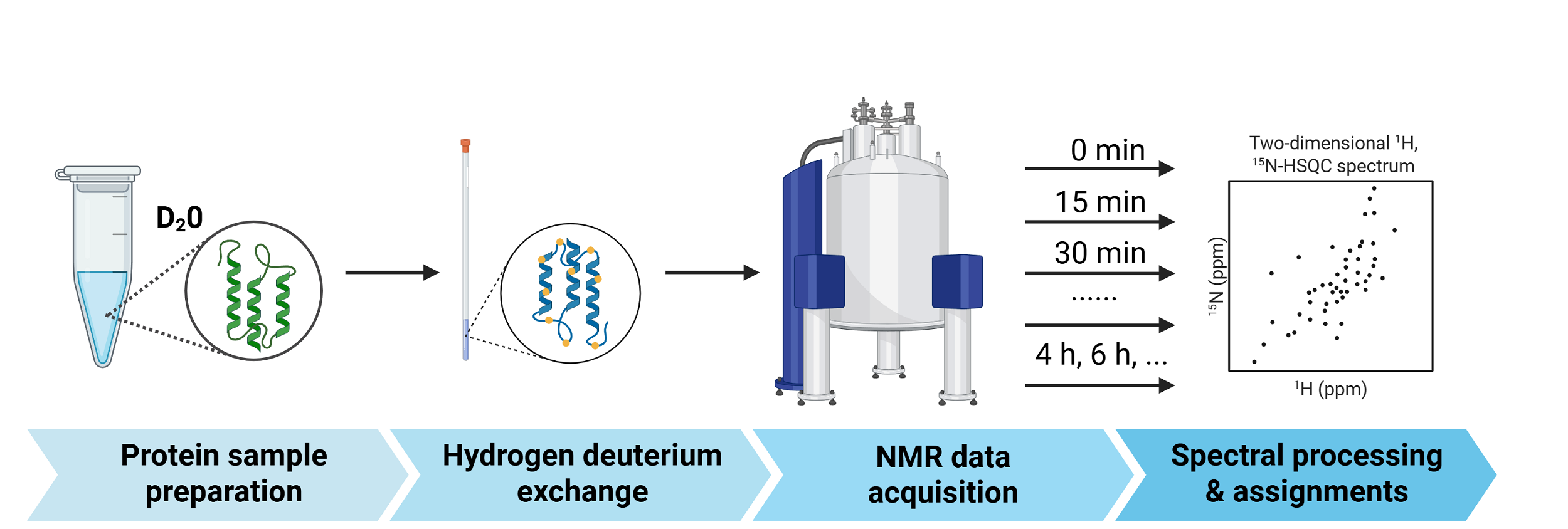 | Fig. 2 HDX-NMR workflow, including protein sample preparation, hydrogen-deuterium exchange, NMR data acquisition, spectral processing and assignments |