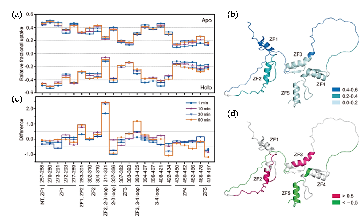 Fig. 4 HDX-MS reveals the highly dynamic conformational characteristics of INSM1 in binding to nucleic acids[43]. (a) A mirror plot of HDX-MS data comparing the relative deuterium uptake for each peptide of free INSM1 ZF1-ZF5 (Apo) and INSM1 ZF1-ZF5 bound by M2 DNA (Holo); (b) The relative deuterium uptake for each peptide of Apo INSM1 ZF1-ZF5 at 1 min was mapped on the structure of INSM1 ZF1-ZF5; (c) A difference plot of HDX-MS data showing the changes in relative deuterium uptake between Apo and Holo INSM1 ZF1-ZF5; (d) The segments of INSM1 ZF1-ZF5 with significant changes between Apo and Holo states at 60 min